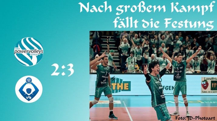 Der Tiebreak gab einen erneuten Eindruck von der kämpferischen Einstellung unserer Jungs. Sie ließen sich mal wieder nicht von einem Rückstand aufhalten, drehten den Entscheidungssatz zur 10:7-Führung. Umso bitterer war es, dass die positiven Aktionen an dieser Stelle endeten. Die Gäste vom Bodensee um den 30-Punkte-Angreifer van Huizen sorgten beim 12:15 dafür, dass die Dürener Festung fiel.