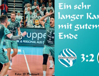 Auch im dritten Satz blieb die Partie spannend. Erst ging unsere Mannschaft 11:8 in Führung, dann meldete sich Herrsching mit dem Ausgleich zum 12:12 zurück. Bis zum letzten Ballwechsel war der Satz offen. Dann verwandelte unser Team den Matchball zum 25:23. Herrschings Trainer Bob Ranner verzögerte den Dürener Jubel noch ein bisschen mit einer letzten Challenge, aber dann konnten wir endgültig feiern. Drei zu null gegen Herrsching, das fühlt sich richtig gut an.