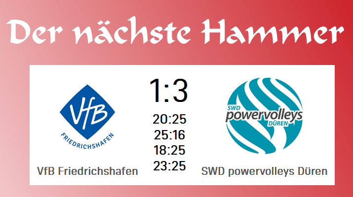 Den zweiten Satz vergessen wir mal schnell. Da passierte nämlich das, was sonst immer passiert, wenn unsere Jungs am Bodensee spielen: Die Häfler packen ihre gnadenlosen Aufschläge aus und Düren hat keine Chance. Aber diesmal haben sie den Rückschlag schnell abgehakt. Im dritten Satz fanden sie zurück zu ihrem starken Spiel und hatten die Gastgeber wieder im Griff. Als es am Ende sogar wieder ziemlich deutlich wurde, musste Max Günthör als Dyn-Kommentator feststellen, dass Friedrichshafen gerade zusammenbricht. 25:18 für Düren, bäm!